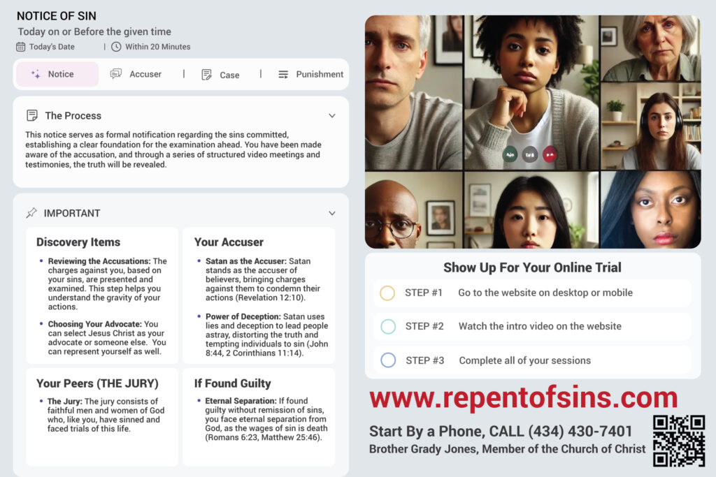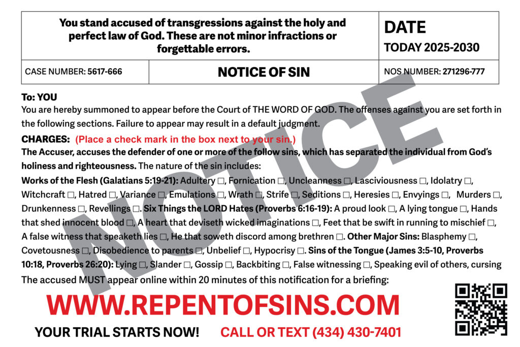 You are hereby summoned to appear before the Court of THE WORD OF GOD. The offenses against you are set forth in the following sections. Failure to appear may result in a default judgment.